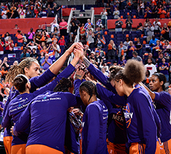 Nike tapped into USA Women’s Basketball and WNBA Nike athletes for insights on the feel and make-up of the uniforms, which will allow enhanced movement for athletes delivered through vent technology in the shorts and scapula cuts on the jersey. These uniforms were designed with the female athlete in mind and also feature two-tone orange, the Mercury’s secondary color, with purple accents. The back collar of the jersey features a silver championship tab that sports the number “3,” representing the Mercury’s three WNBA titles (2007, 2009, 2014).